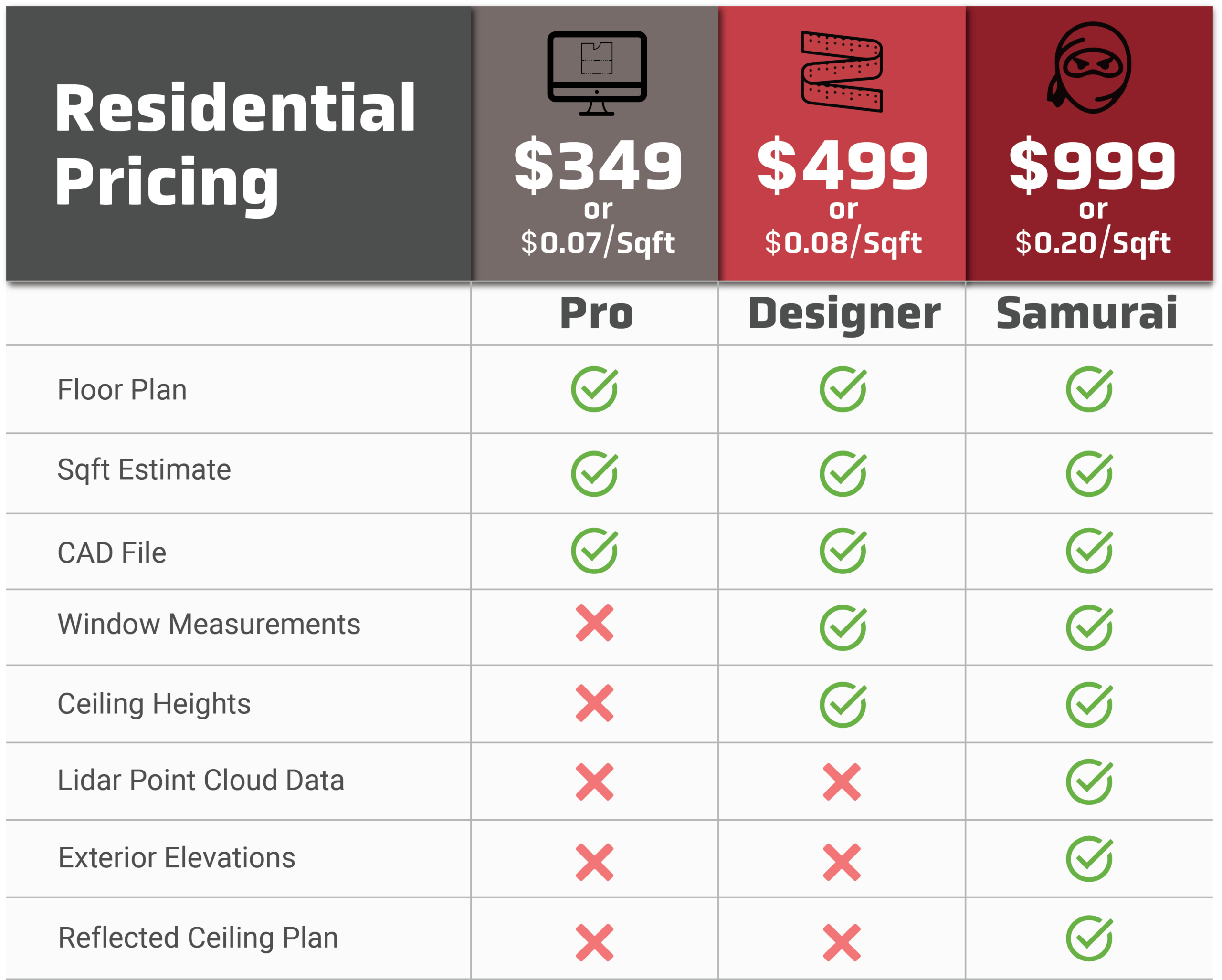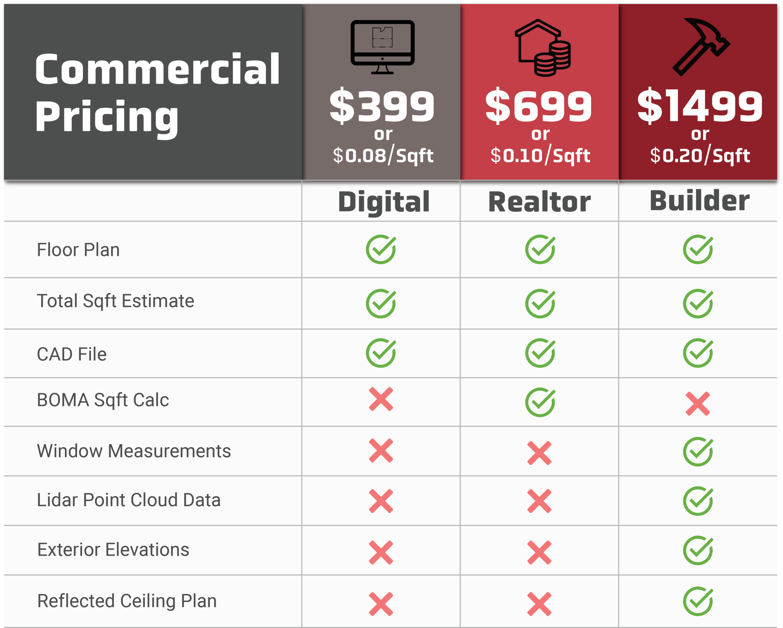 We offer many different packages which are separated into two categories “residential” and “commercial”. The table below shows the documents included in each package as well as the price. All of our packages are charged by the square foot with a minimum price threshold. Square footage prices are based on the total area we measure, not just the heated area. Please reach out if you have any questions.